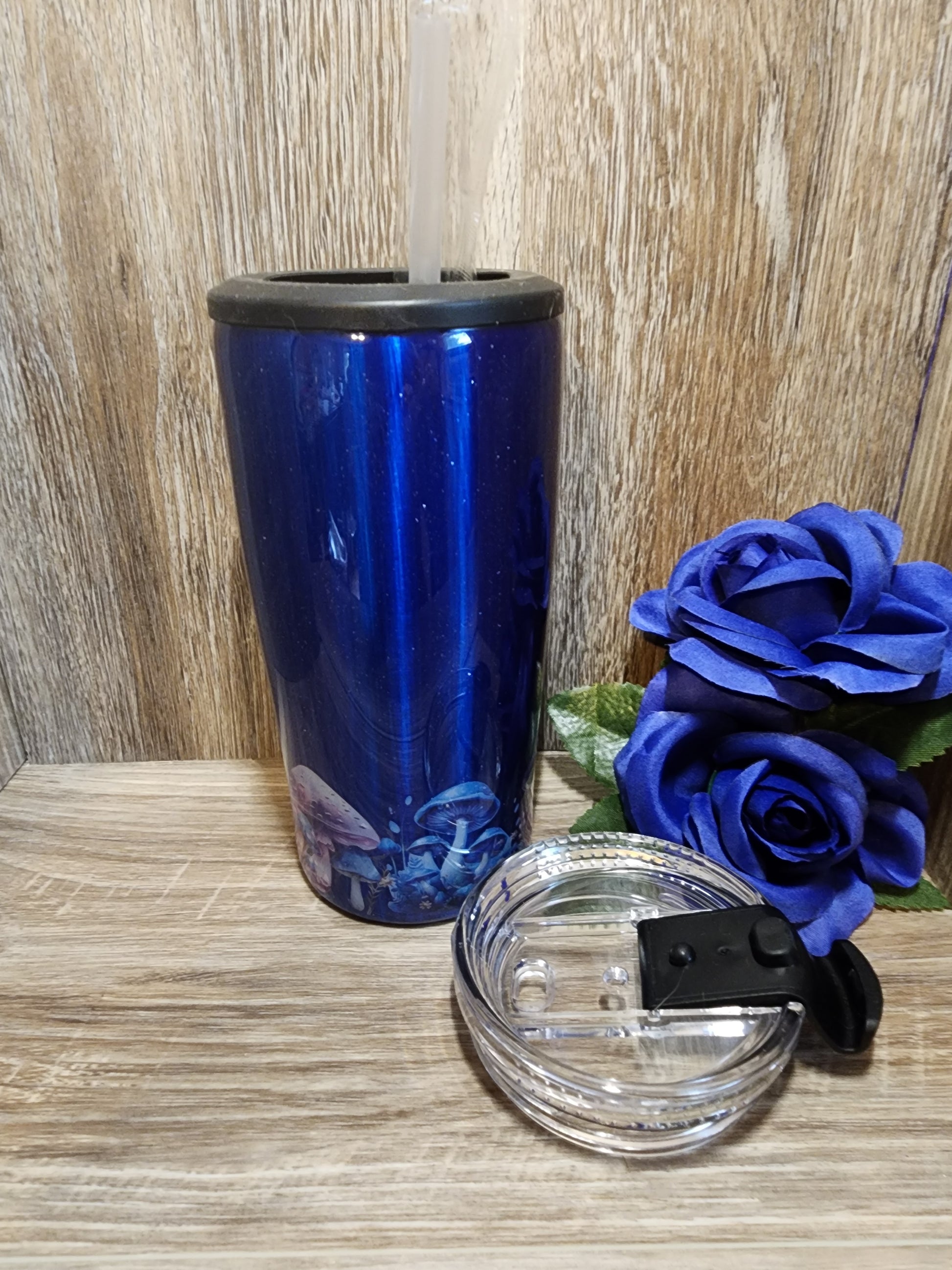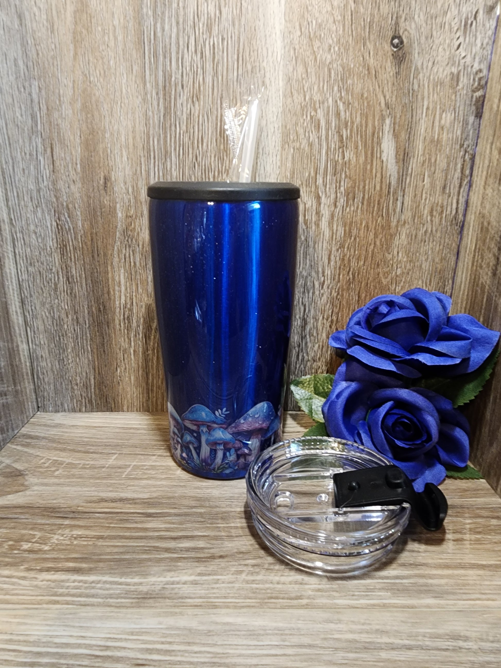 12 oz dual can koozie. Can be used as a can koozie or also comes with screw on lid. Metallic blue glaze with mushrooms around the bottom