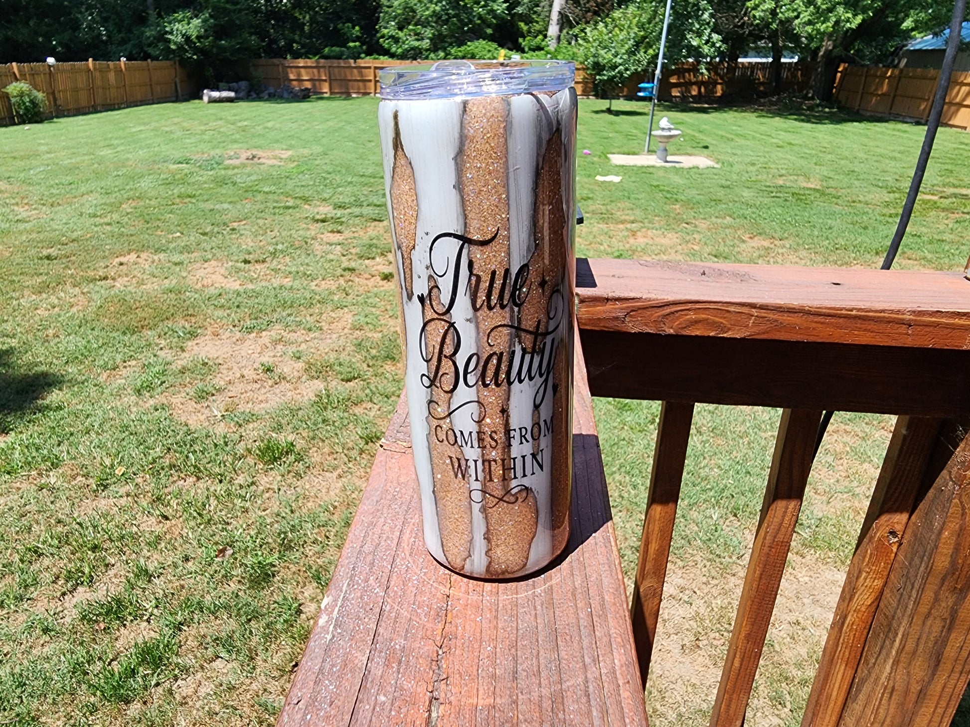 20 oz skinny tumbler, glitter base and dirty pour. Color may vary due to lighting