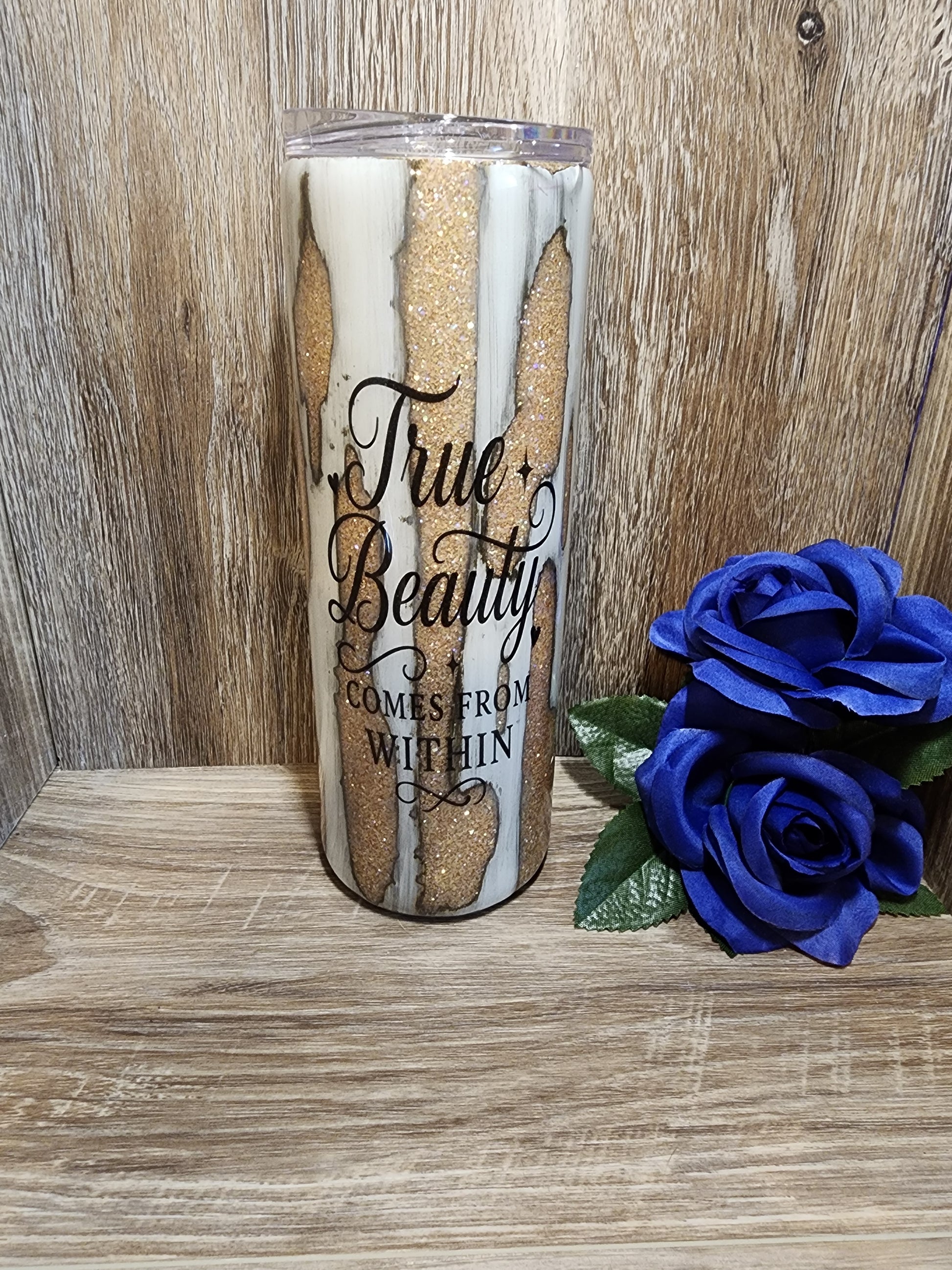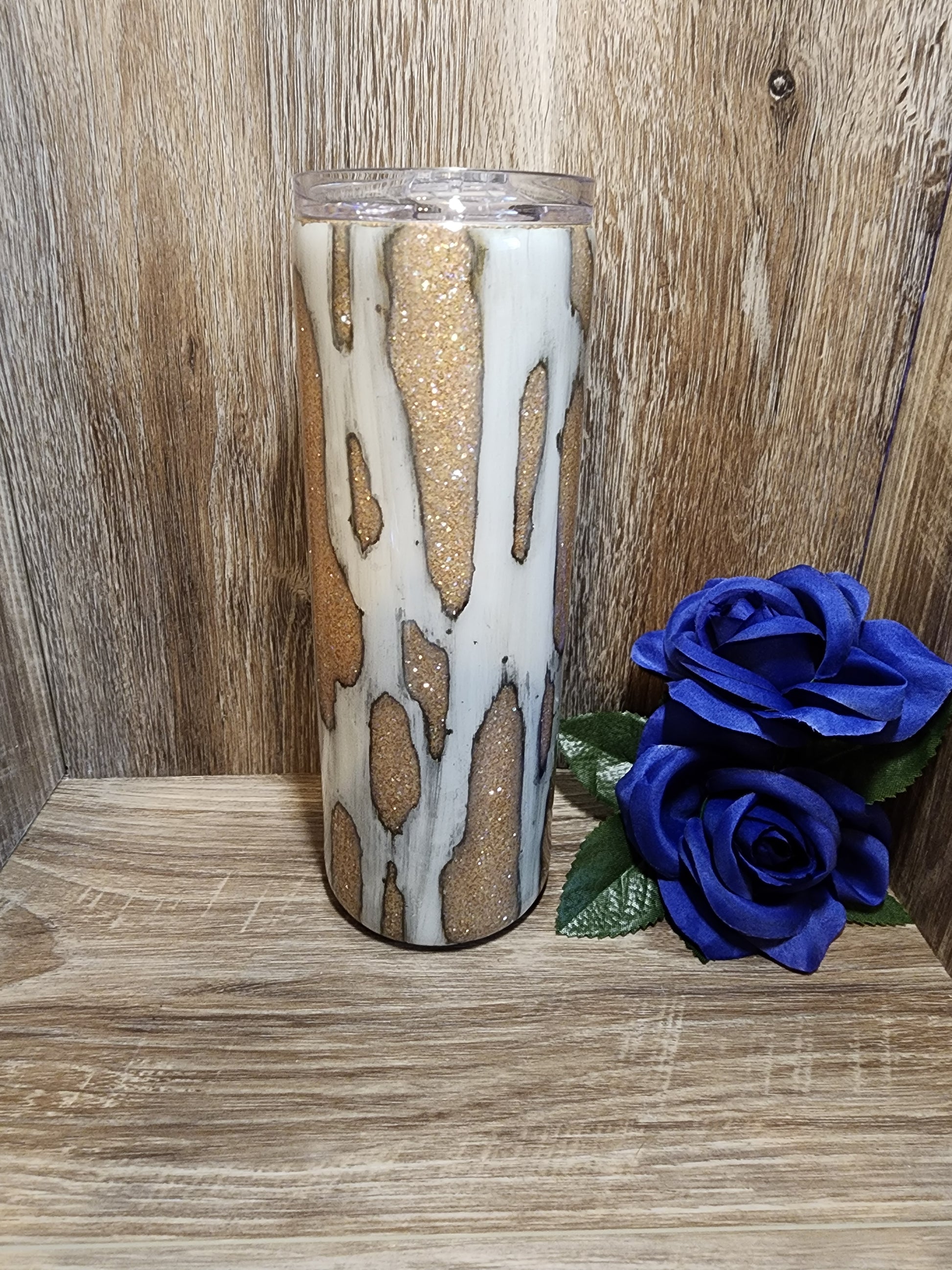 20 oz skinny tumbler with champagne gold glitter base white dirty pour with a rub out with decal. Beautiful