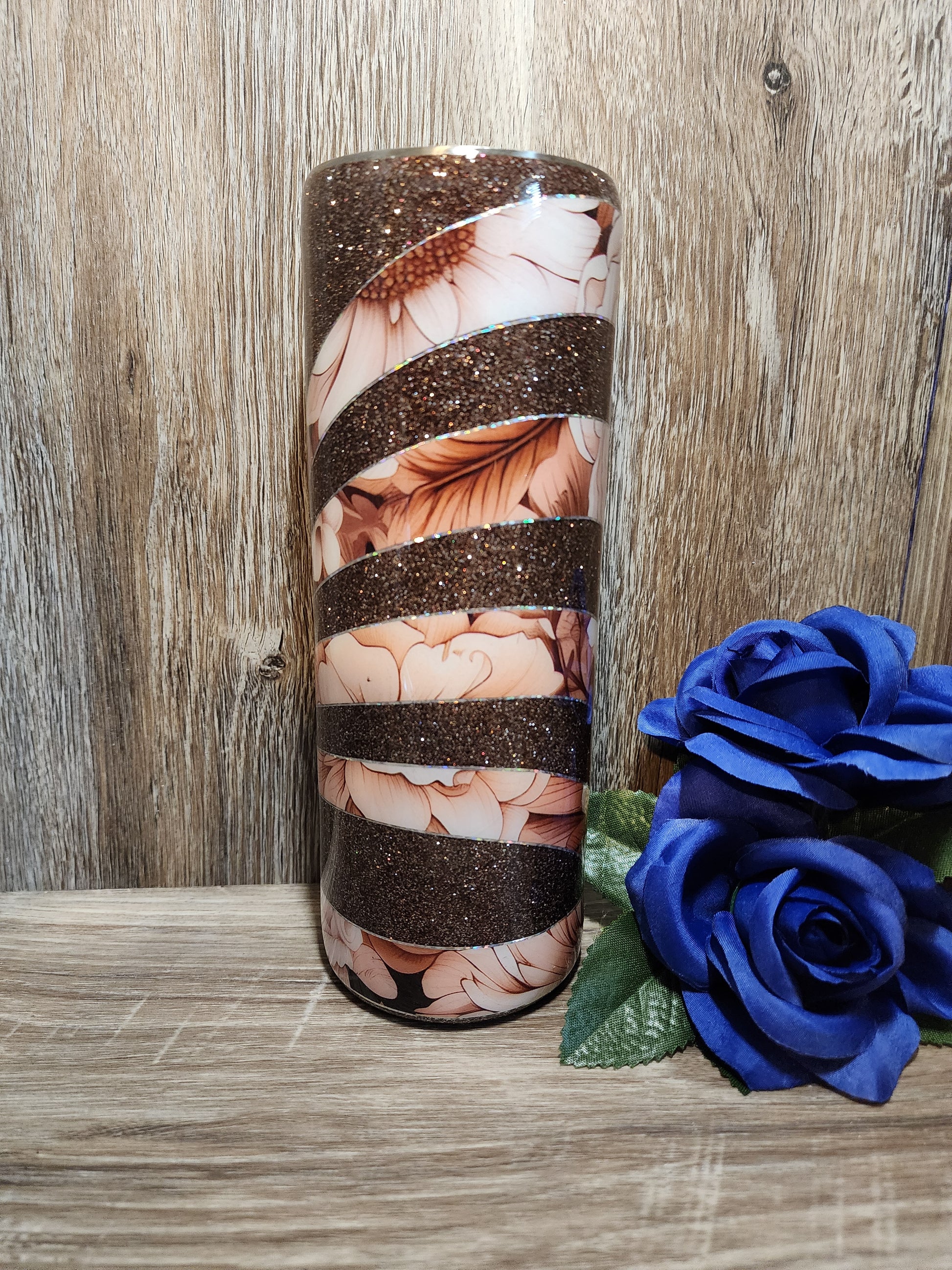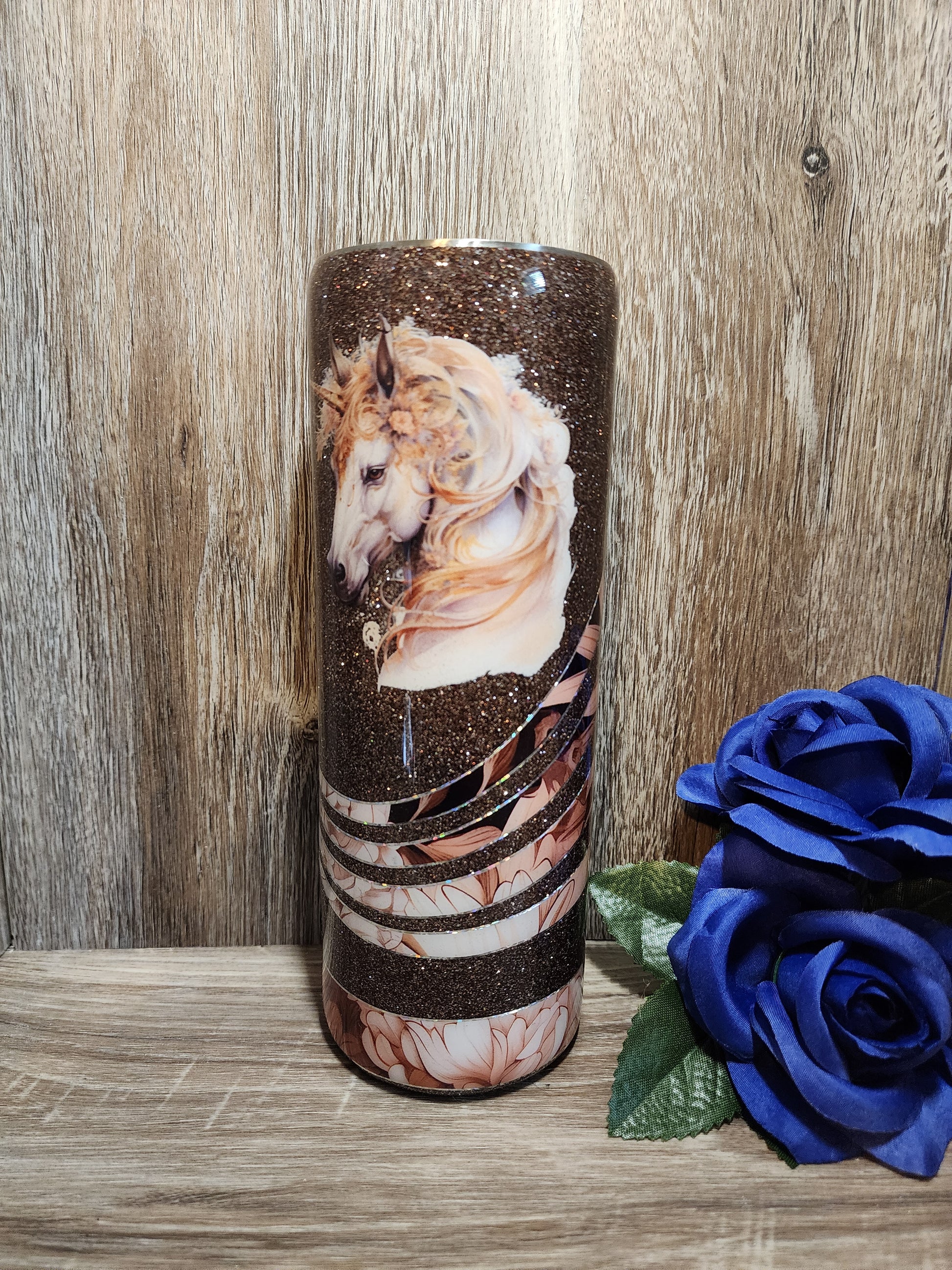20 oz skinny tumbler with brown glitter, vinyl and unicorn