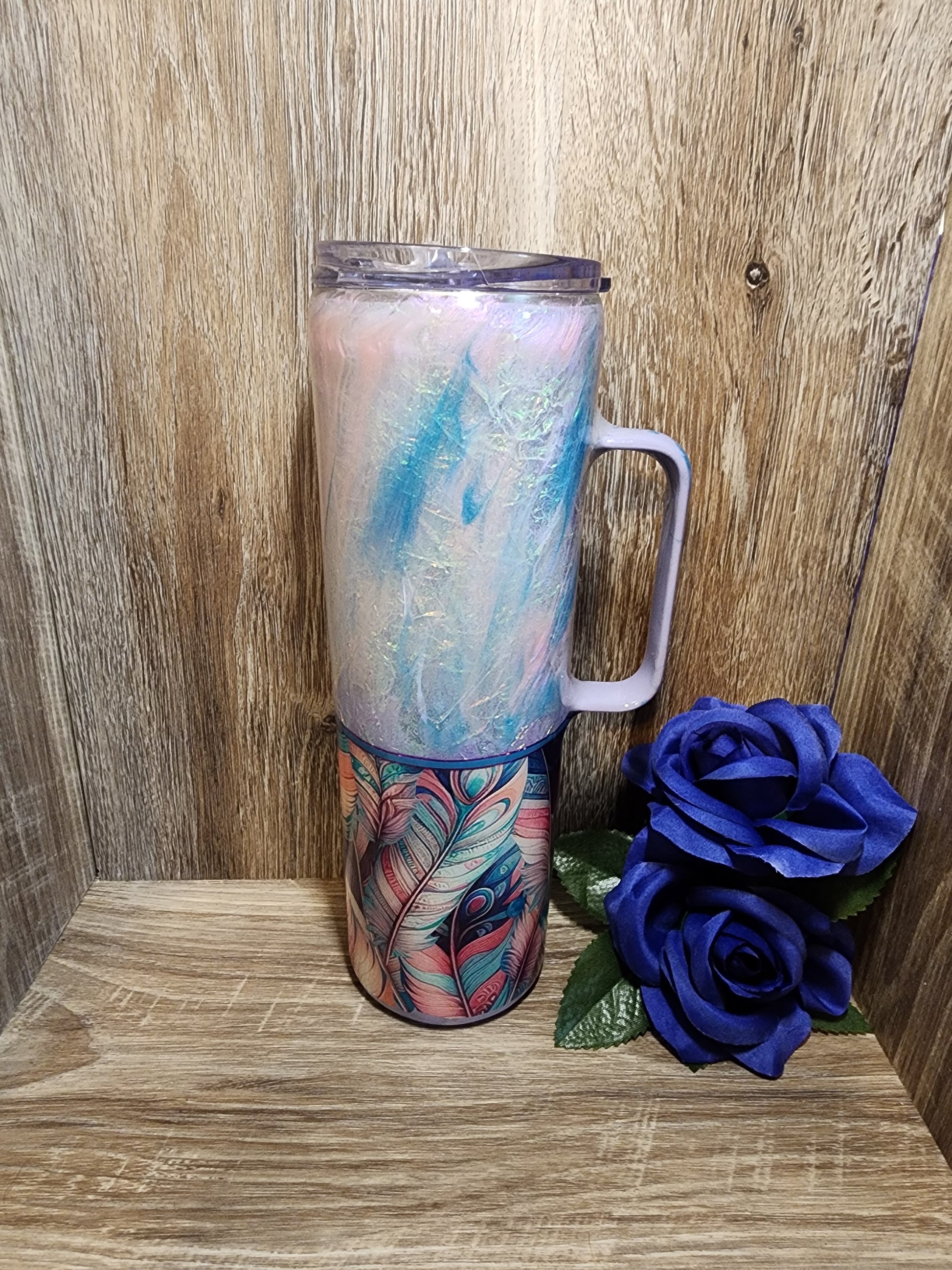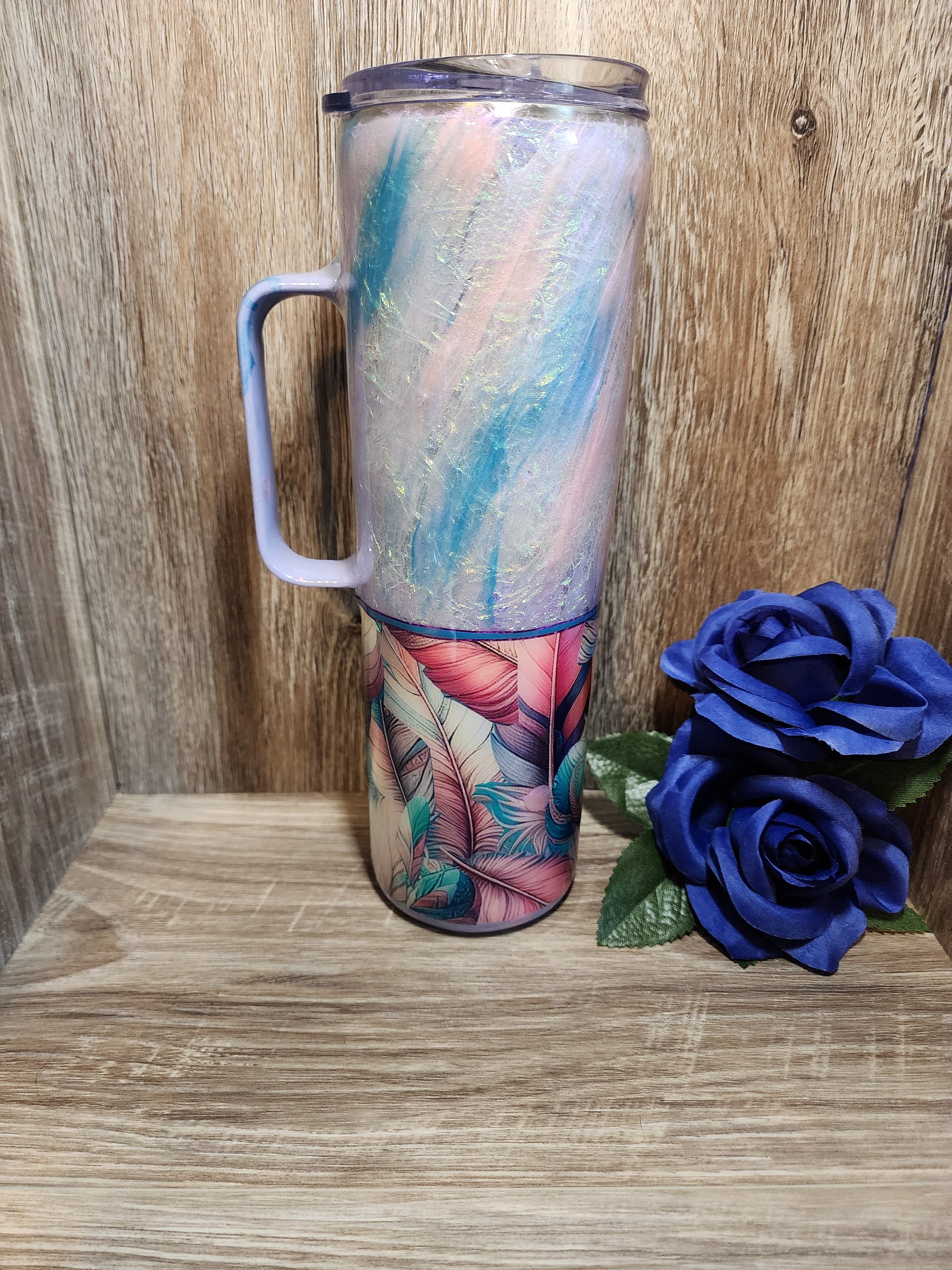 20 oz skinny with handle. Pink iridescent cellophane with light blue and purple micas. Feather vinyl on the bottom