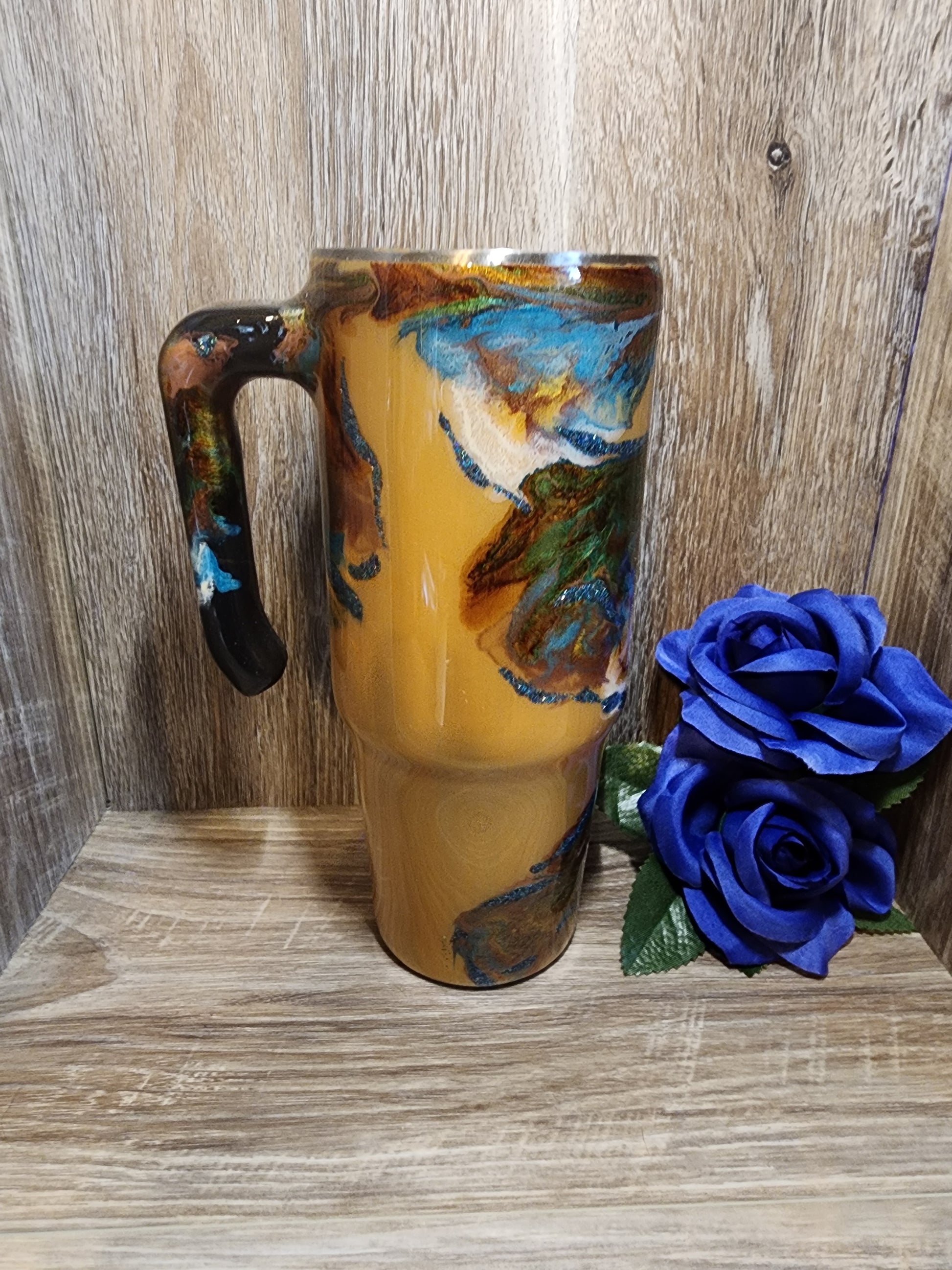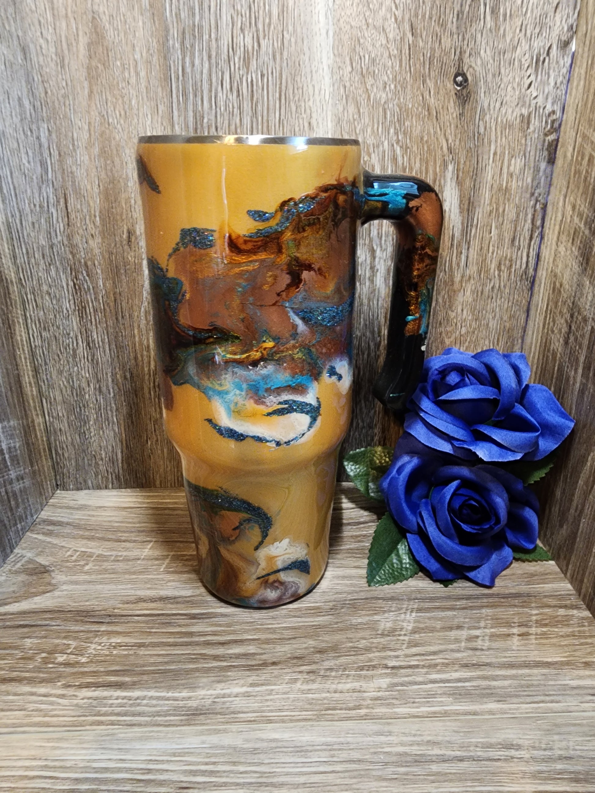 30-oz grippy Tumbler with gold base, brown and teal ink swirls and glitter