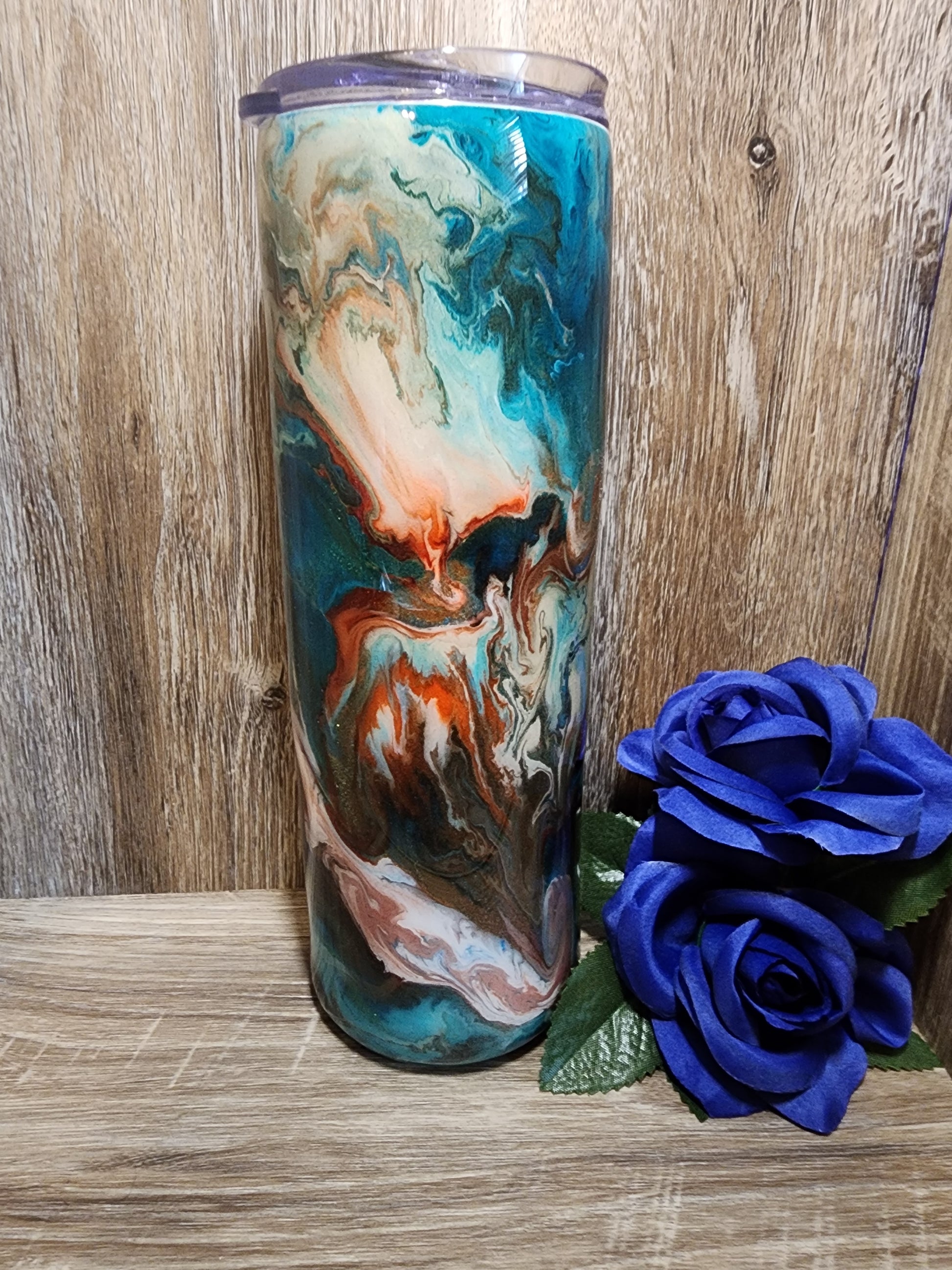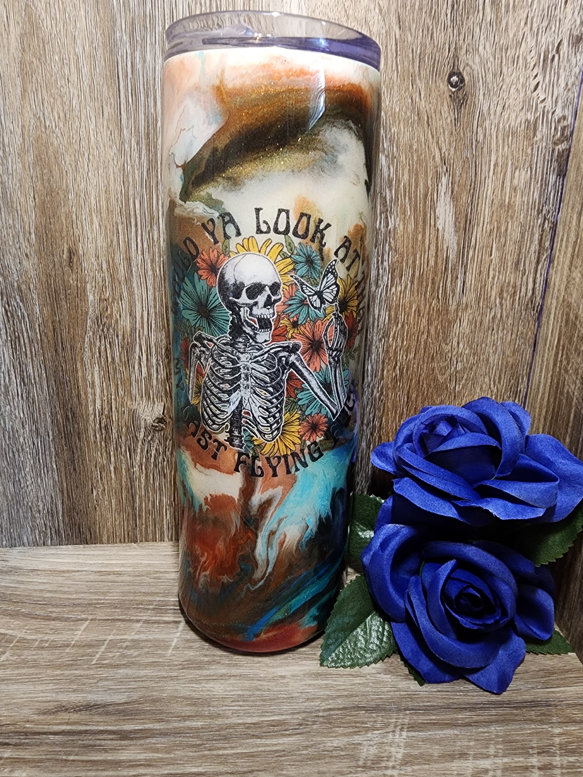 30 oz skinny tumbler in western colors with glitter and "There goes my last flying f##k" decal