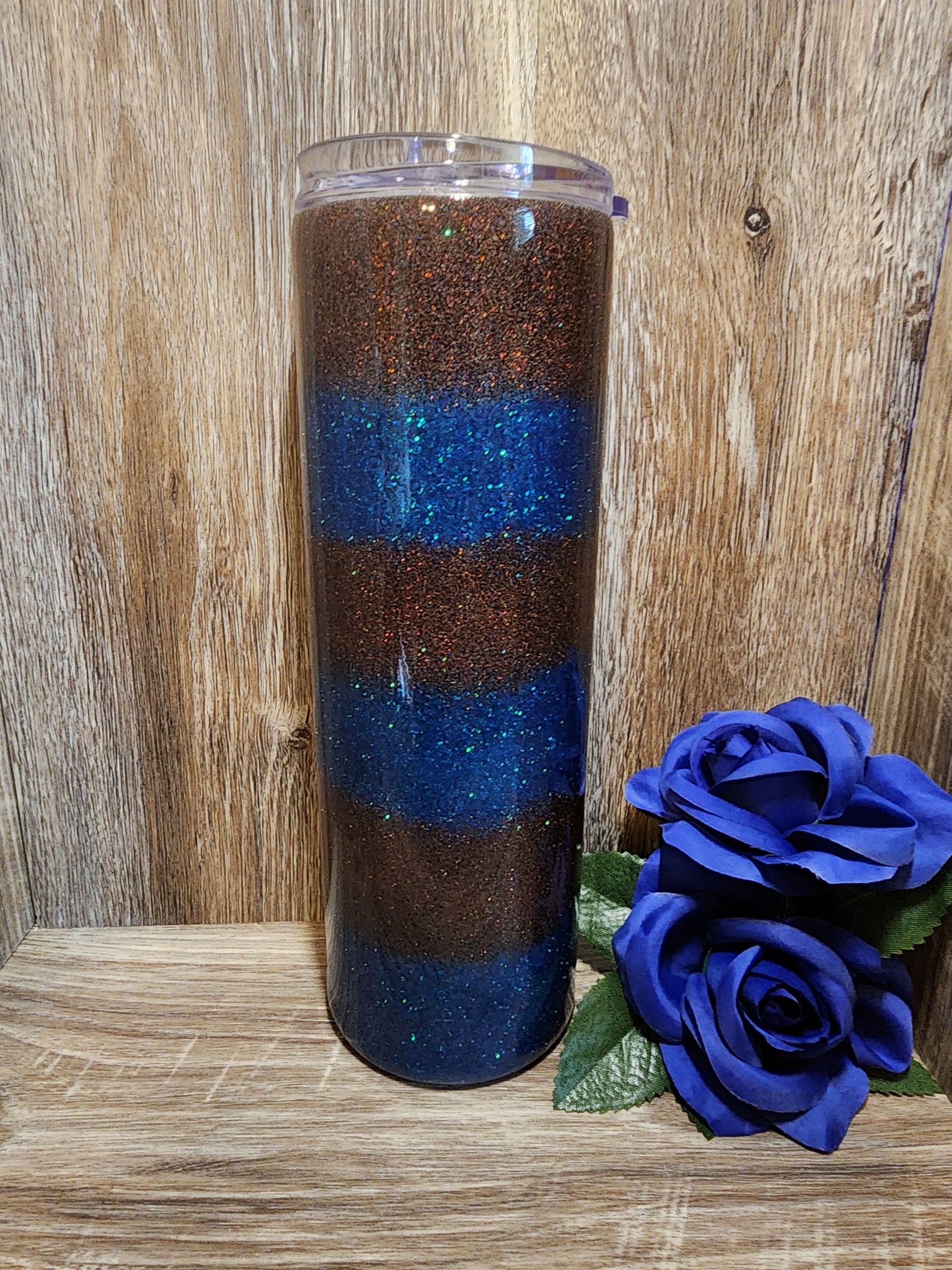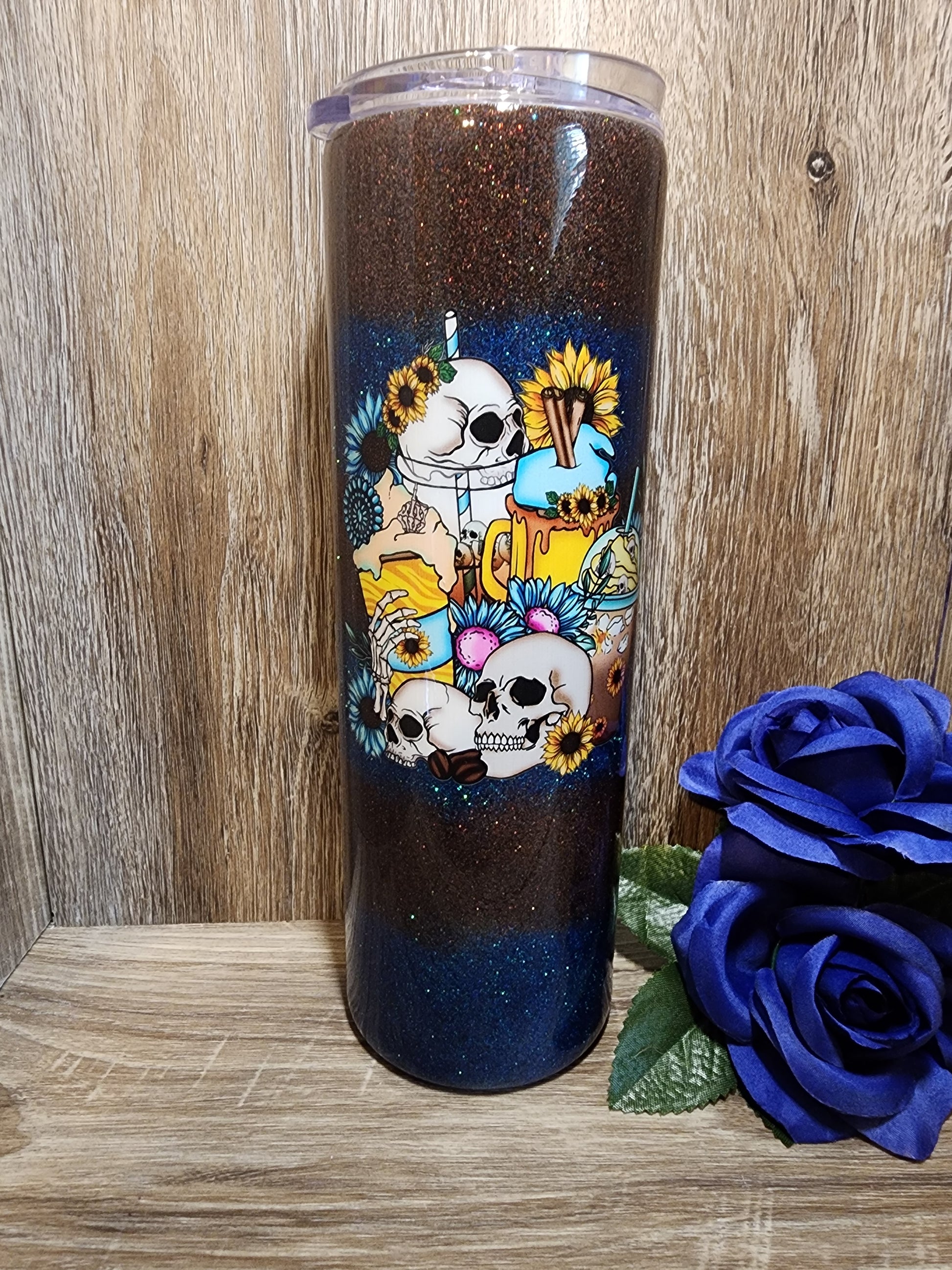 30 oz skinny tumbler with brown and teal glitter. Decal with skulls and iced coffee