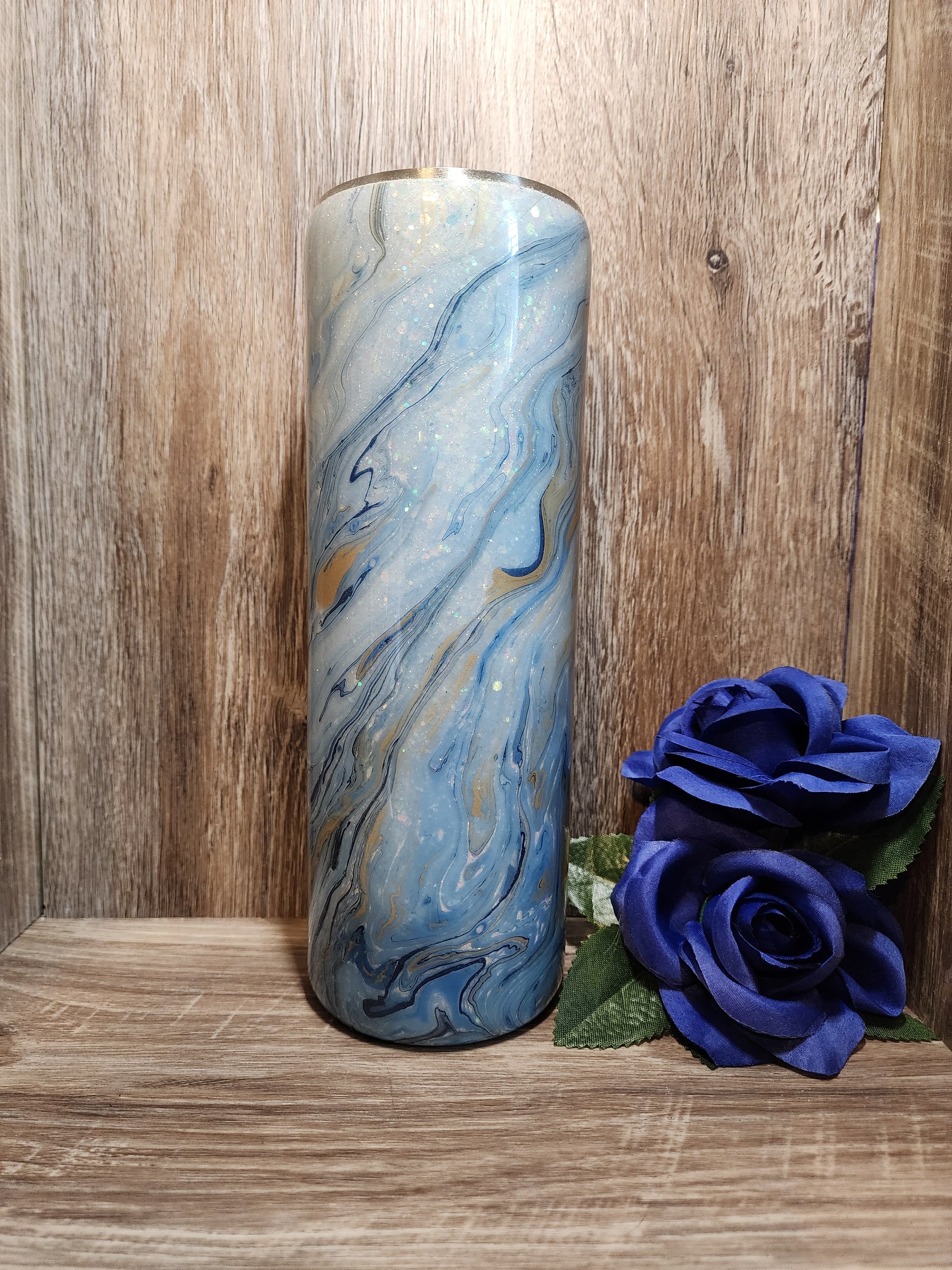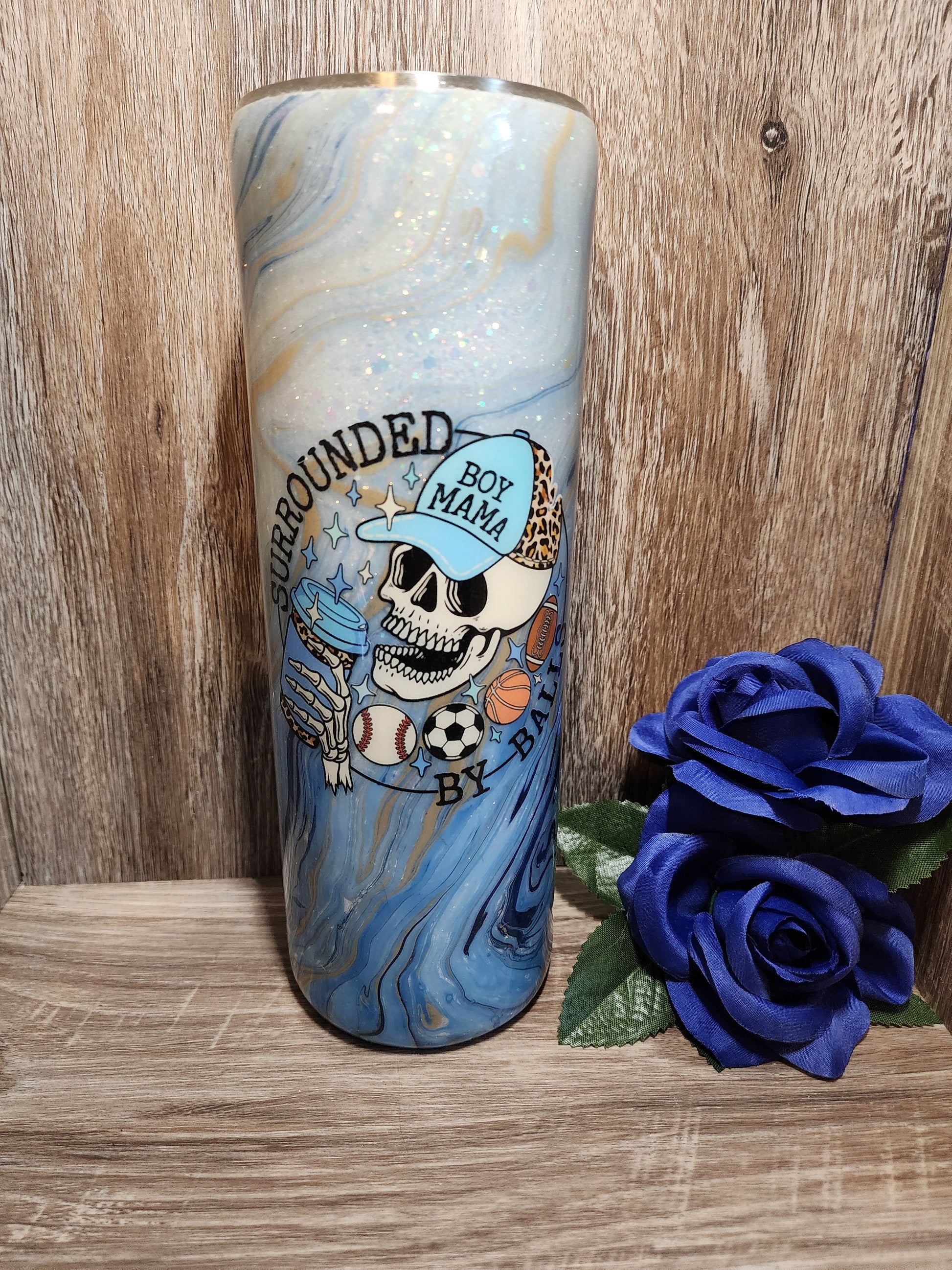 30 oz skinny with glitter base. Hydro dipped in multi blues. " Surrounded by balls " decal. Definitely a boy's mom cup.