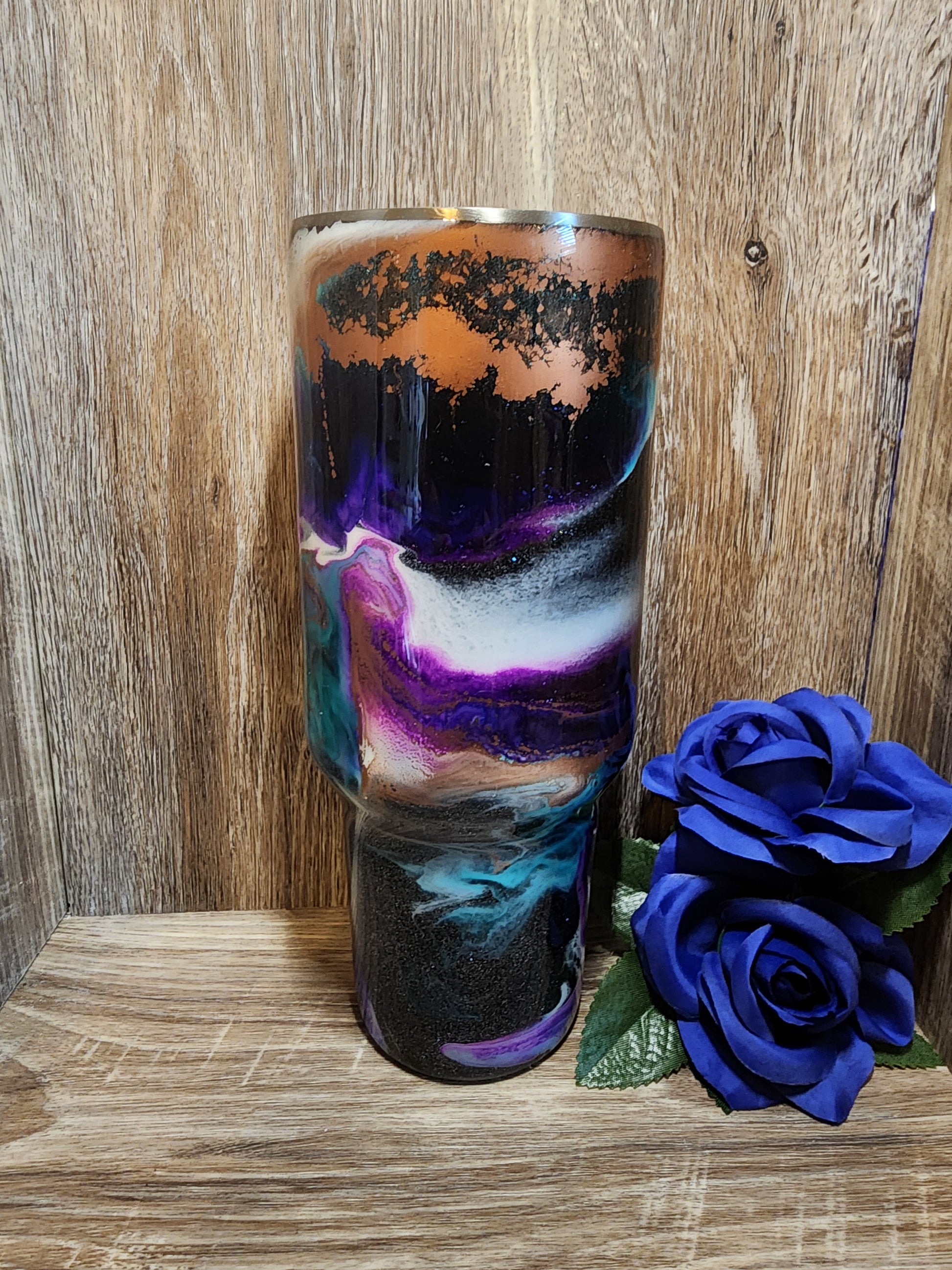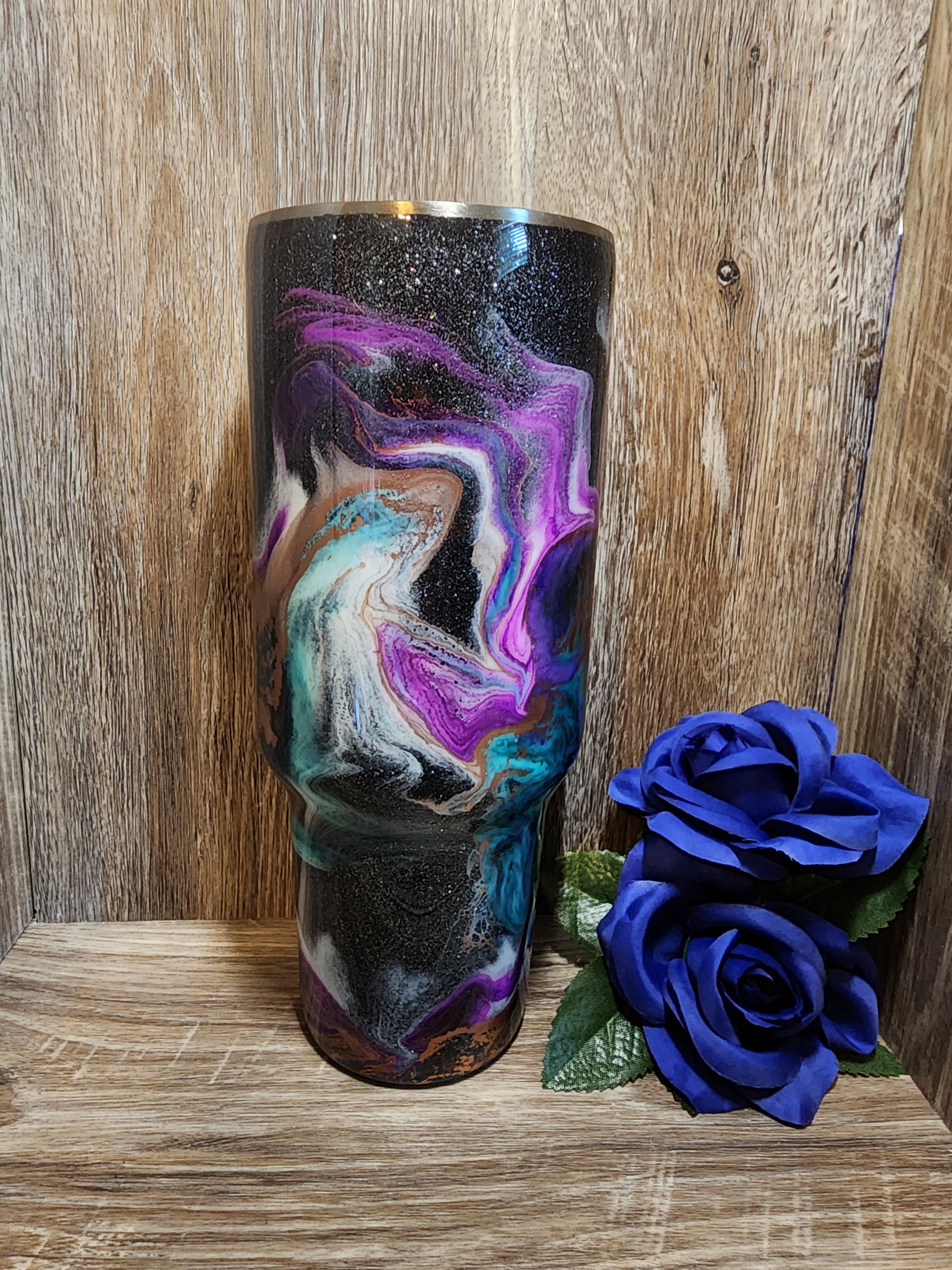 40 oz tumbler with multi color metallic ink swirls. Has screw on removable handle. Can be used with or without the handle